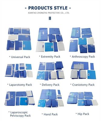 | Universal Pack | 1. Mayo stand cover: 80*145cm 1pc 2. OP tape 10*50cm 2pcs 3. Hand towel 40*40cm 2pcs 4. Side drape 75*90cm 2pcs 5. Head drape 150*240cm 1pc 6. Foot drape 150*180cm 1pc 7. Reinfored gown L 2pcs 8. Wrapping cloth 100*100cm 1pc 9. Instrument table cover 150*200cm 1pcs |